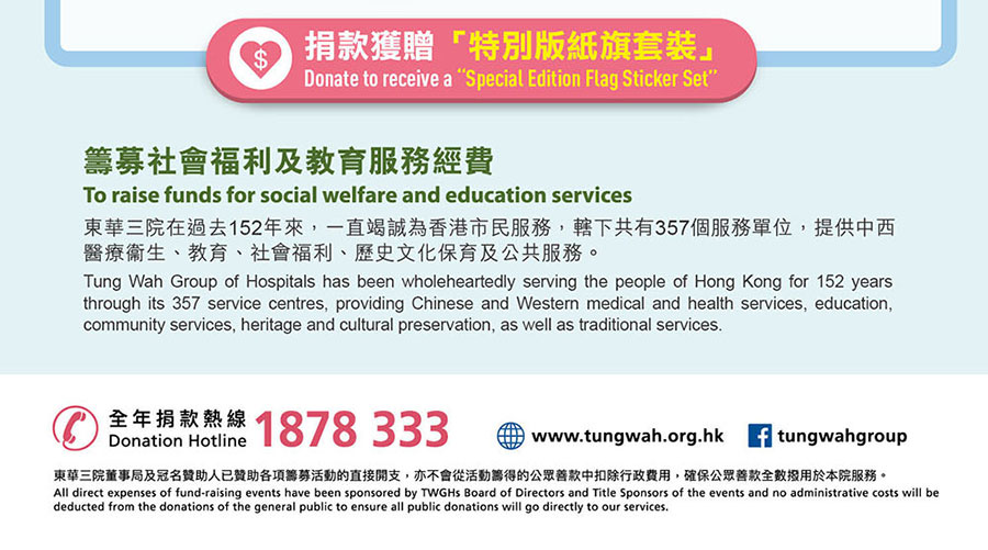 查詢及建議:東華三院企業傳訊科 傳真:(852) 2975 9521 或 電郵 enquiry@tungwah.org.hk