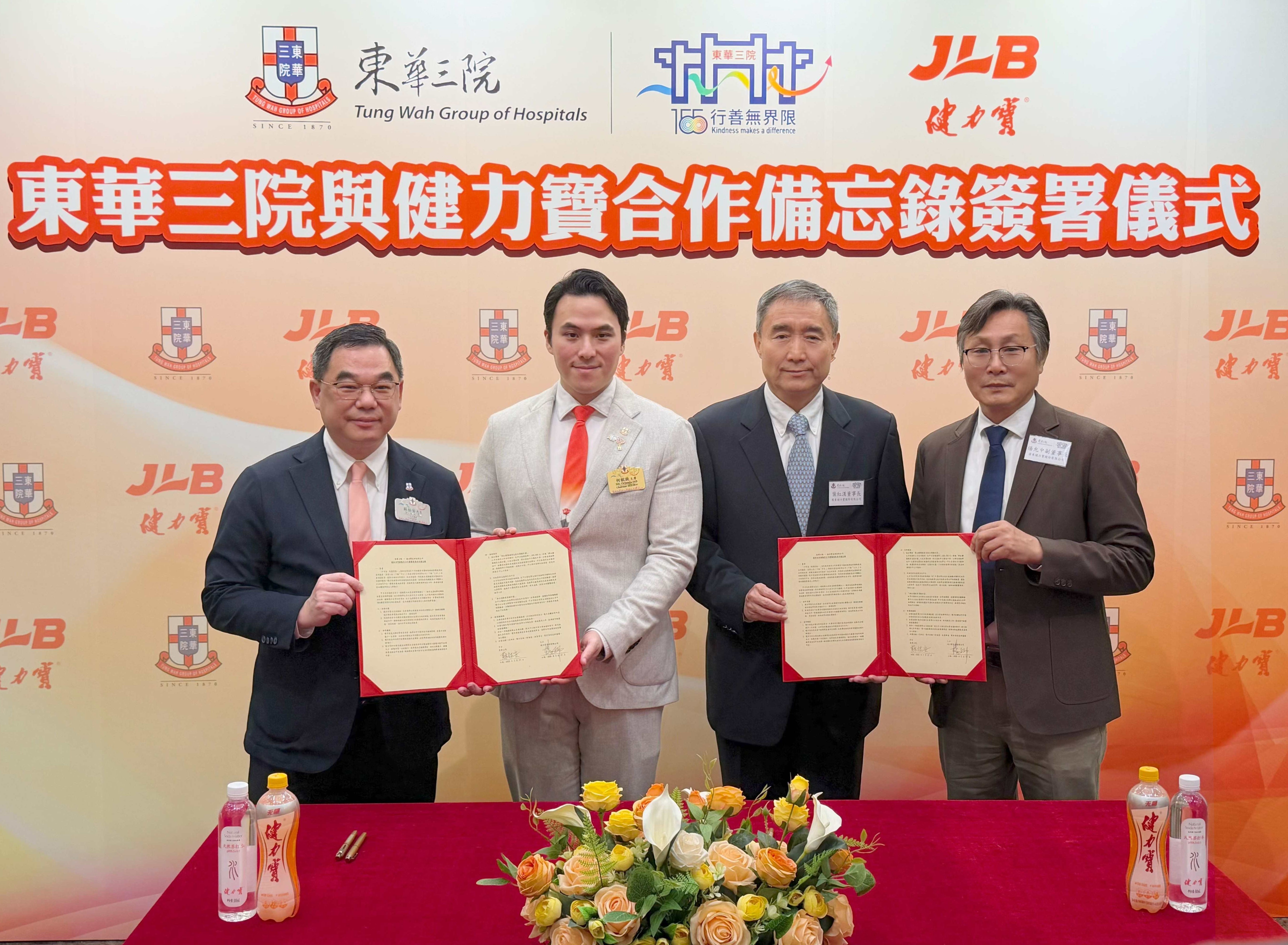 簽署儀式在東華三院主席兼名譽校監何猷啟先生及廣東健力寶股份有限公司董事長葉紅漢先生見證下,由東華三院行政總監蘇祐安先生及廣東健力寶股份有限公司副董事長楊允中先生代表簽署合作備忘錄。